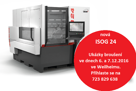 Zveme Vás na ukázky broušení na zcela nové brusce ISOG 24. Ve dnech 6. a 7. prosince 2016 zažijte ve výrobním závodě ve Weilheimu inovace v koncepci 5-osého broušení. Stačí nám do pátku 2. prosince nahlásit počet osob a jaký den se chcete této akce zúčastnit - tel.č. 723 829 638 / info@ingsimunek.cz