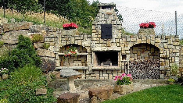 Dominantní krb Legner z přírodního pískovce má udírnu a otevřené odkládací police. Posezení ryze přírodní: kamenný stůl, lavice. FOTO: HRDINA & ČESKÉ PÍSKOVCE