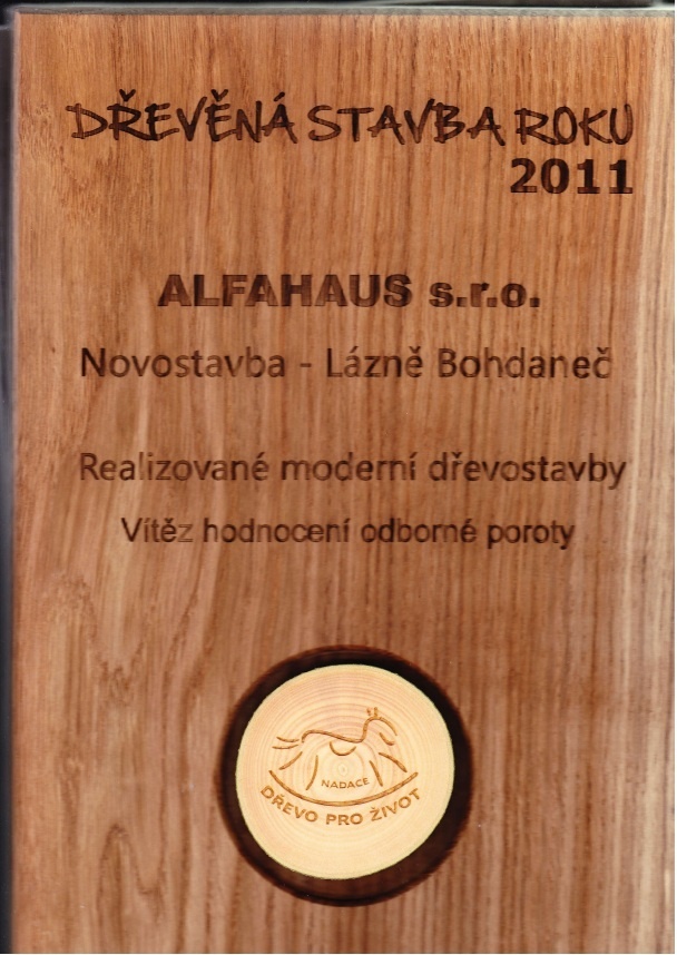 Slavnostní vyhlášení vítězů soutěže „ Dřevěná stavba roku 2011“ pořádané Nadací dřevo pro život pod záštitou Ministerstva zemědělství České republiky úspěšně proběhlo na 7. mezinárodním veletrhu DŘEVOSTAVBY 2012 v pražském Veletržním paláci. Společnost Alfahaus se stala vítězem hodnocení odborné poroty a finalistou veřejného hlasování.