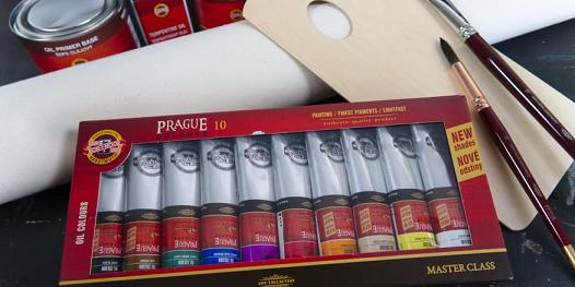 Nejkrásnějším médiem jsou pro mnoho umělců olejové barvy. Je to vůně terpentýnu a lněného oleje, která dává ateliéru kouzlo. Plátna vyvedená v oleji mají něco, co jen stěží nahradí jiné médium. Kromě vůně můžeme jmenovat jemnost, plasticitu a přirozenost, s jakou barvy odráží světlo. Olejové barvy umožňují v podstatě vše, co si může malíř přát, pokud se s nimi naučí pracovat. Není problém si namíchat odstín a pracovat s plochami. Můžeme s nimi naopak malovat tak, že spolu odstíny mísíme přímo na plátně. Není potřeba mít vše promyšleno, můžeme improvizovat, být expresivní a vytvářet obraz až na plátně. Nebo naopak můžeme zvolit precizní postup a malovat jemné vrstvy, kterými postupně modelujeme tvar. Možné je vše, ale je třeba brát v úvahu, že základní vlastností olejových barev je pomalé schnutí. Pokud s olejovými barvami pracujeme poprvé, může se to jevit jako překážka, protože chceme pracovat rychleji, než nám to médium umožňuje. Je tedy dobré si promyslet, co chceme namalovat a jak budeme postupovat, aby se různé odstíny vzájemně nemísily, pokud nechceme. Set olejových barev Prague obsahuje deset odstínů v plastové zasouvací vaničce. Z této základní řady lze namíchat libovolné odstíny, je tedy vhodná pro někoho, kdo si pořizuje první barvy. Časem však zjistíme, že některé odstíny preferujeme a jiné ne, je tedy vhodnější dokupovat požadované odstíny individuálně, na výběr máme až z 61 tub o objemu 40 ml. Menší objem barvy v tubě je nepraktický, protože spotřebu barvy nelze úplně omezit, zvláště pokud pracujeme s větším formátem. K barvám budeme potřebovat také terpentýn a lněný olej. Základní lahvička terpentýnu je svou velikostí vhodná spíše do plenéru nebo pokud teprve začínáme a nejsme si jistí, zda bude olejomalba naše oblíbená technika. Pokud to s malbou myslíme vážně, je dobré udělat si zásoby. Terpentýn je nutný nejen k ředění barvy, ale také k vymývání štětců. V tomto ohledu se vyplatí pečlivost. Dobrý štětec je poměrně drahá záležitost a ledabylé zacházení jej rychle znehodnotí. KOH-I-NOOR nabízí širokou škálu štětců Kolinsky určených pro práci s olejovými barvami. K malbě olejovými barvami nám nebude stačit obyčejný papír. Je potřeba si pořídit plátno, sololit, dřevěnou desku nebo speciální papír určený pro práci s olejovými barvami. Plátno napnuté na rámu je poměrně lehké koupit, u větších formátů je lepší nechat si plátno napnout v dílně, protože to vyžaduje určitou sílu a prostor pro manipulaci. U menších formátů přináší své kouzlo, když si ho sami napneme. Na napnutí používáme buď kovové sponky, nebo krátké hřebíčky se širokými hlavičkami. Postupujeme od středu do stran, kdy střídáme protilehlé strany tak, aby se plátno vypnulo rovnoměrně. Na závěr můžeme plátno přetřít čistou vodou, a pokud se nám prověsí, je dobré jej znovu napnout. Jako podklad můžeme použít olejový nebo akrylový šeps, aby zpevnil a vyplnil plátno, čímž omezí spotřebu barvy. Akrylový šeps není tak hladký jako olejový, ale rychleji schne. Na menší plátna stačí malé balení. Plátno může na rámu časem povolit. Abychom obraz dodatečně vypnuli, je potřeba mít schovaná dřívka, která se dodávají spolu s rámem. Ta vtlučeme na místa v rozích rámu, kde se do sebe lišty vkládají. K olejovým barvám si většinou kupujeme lněný olej a mícháme jej s barvou. Opatrně, pokud jej do barvy přidáme moc, bude se místo nápadně lesknout, popřípadě vytvoří žlutou krustu. Použijeme-li naopak k ředění barvy terpentýn, barva rychleji zasychá. Této možnosti využívá spoustu umělců při podmalbě, kdy vědí, že nepotřebují silnou vrstvu barvy, ale pouze „zatónovat“ plátno. Hotová malba se nechá schnout, a to poměrně dlouho (i několik měsíců), než se přetře závěrečným damarovým lakem. Je to právě lak, který dělá olejomalbu lesklou a chrání barvy před poškozením.